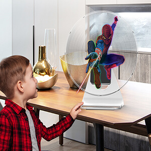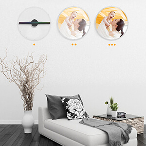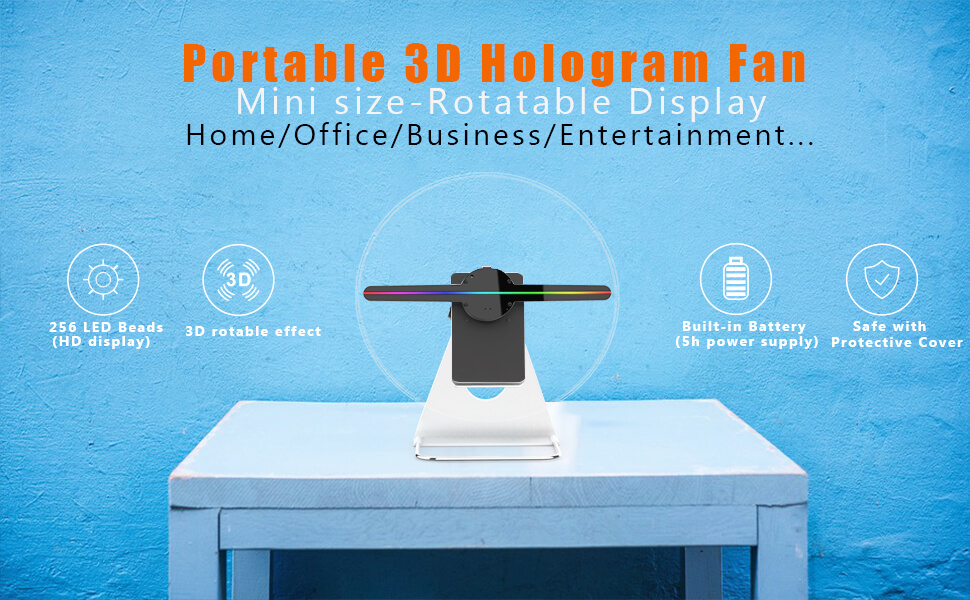 The mini-size innovative 3D hologram fan offers a funny display of photos or videos for your home, office, shops. It uniquely introduces a hi-tech hardware device generating stunning 3D visuals perceived by viewers as hi-resolution holograms floating in the mid-air.
